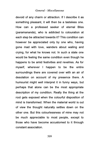 devoid of any charm or attraction. If I describe it as something pleasant, it will then be a tasteless one. How can a professed seeker of eternal Bliss (paramananda), who is addicted to colouration at each step be attracted towards it? This condition can however be appreciated only by one who, having gone mad with love, wanders about wailing and crying, for what he knows not. In such a state one would be feeling the same condition even though he happens to be amid festivities and revelries. As for myself, wherever I happen to be the entire surroundings there are covered over with an air of desolation on account of my presence there. A humourist might well interpret it in funny ways, but perhaps that alone can be the most appropriate description of my condition. Really the thing at the root gets exposed when the colourful disposition of mind is transformed. When the material world is out of view the thought naturally settles down on the other one. But this colourlessness of mine may not be much appreciable to most people, except to those who have become accustomed to it through constant association.