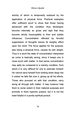 activity of which is temporarily subdued by the application of physical force. Practical examples offer sufficient proof to show that those having advanced with the condition thus developed, become internally so gross and rigid that they become wholly insusceptible to finer and subtler influences. Concentration effected by forceful suppression of thoughts leaves its weighty effect upon the mind. The force applied for the purpose, also being a physical force, causes its own weight. Thus in a word the state of concentration interpreted as coma is basically wrong, since it keeps one in close touch with matter. In that sense concentration may aptly be compared to a marshy condition, from which it is very difficult for one to extricate himself. He cannot save himself from sinking down deep into it unless he falls flat over it, giving up all his efforts. Those who proceed on with that condition, carry along all through with matter. It may however help them to some extent in their material purposes and promote in them hypnotic powers, but it is not the least helpful in a purely spiritual pursuit.