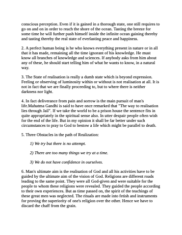 6. Man's ultimate aim is the realisation of God and all his activities have to be guided by the ultimate aim of the vision of God. Religions are different roads leading to the same point. They were all God-given and were suitable for the people to whom these religions were revealed. They guided the people according to their own experiences. But as time passed on, the spirit of the teachings of these great men was neglected. The rituals are made into fetish and instruments for proving the superiority of one's religion over the other. Hence we have to discard the chaff from the grain.