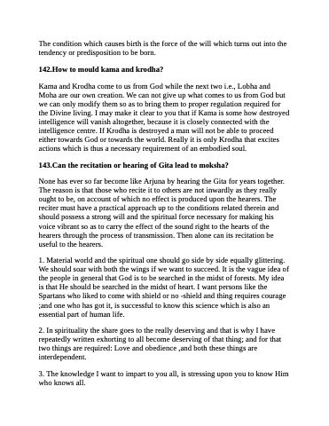 Kama and Krodha come to us from God while the next two i.e., Lobha and Moha are our own creation. We can not give up what comes to us from God but we can only modify them so as to bring them to proper regulation required for the Divine living. I may make it clear to you that if Kama is some how destroyed intelligence will vanish altogether, because it is closely connected with the intelligence centre. If Krodha is destroyed a man will not be able to proceed either towards God or towards the world. Really it is only Krodha that excites actions which is thus a necessary requirement of an embodied soul.