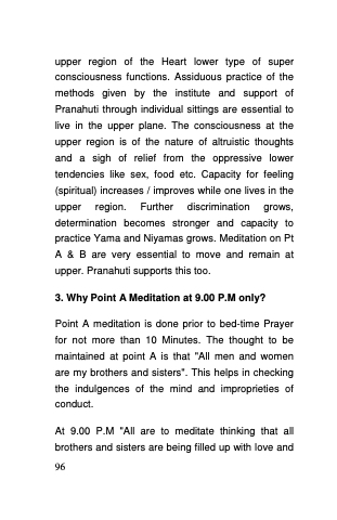 upper region of the Heart lower type of super consciousness functions. Assiduous practice of the methods given by the institute and support of Pranahuti through individual sittings are essential to live in the upper plane. The consciousness at the upper region is of the nature of altruistic thoughts and a sigh of relief from the oppressive lower tendencies like sex, food etc. Capacity for feeling (spiritual) increases / improves while one lives in the upper region. Further discrimination grows, determination becomes stronger and capacity to practice Yama and Niyamas grows. Meditation on Pt A & B are very essential to move and remain at upper. Pranahuti supports this too.
