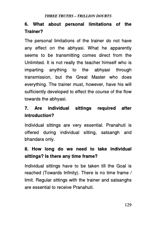 The personal limitations of the trainer do not have any effect on the abhyasi. What he apparently seems to be transmitting comes direct from the Unlimited. It is not really the teacher himself who is imparting anything to the abhyasi through transmission, but the Great Master who does everything. The trainer must, however, have his will sufficiently developed to effect the course of the flow towards the abhyasi.