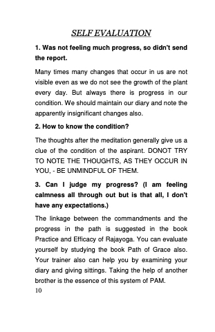 The linkage between the commandments and the progress in the path is suggested in the book Practice and Efficacy of Rajayoga. You can evaluate yourself by studying the book Path of Grace also. Your trainer also can help you by examining your diary and giving sittings. Taking the help of another brother is the essence of this system of PAM.