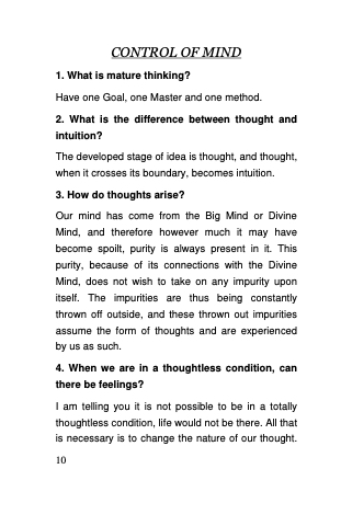 Our mind has come from the Big Mind or Divine Mind, and therefore however much it may have become spoilt, purity is always present in it. This purity, because of its connections with the Divine Mind, does not wish to take on any impurity upon itself. The impurities are thus being constantly thrown off outside, and these thrown out impurities assume the form of thoughts and are experienced by us as such.