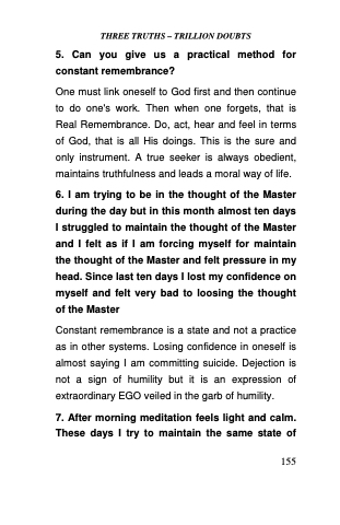 6. I am trying to be in the thought of the Master during the day but in this month almost ten days I struggled to maintain the thought of the Master and I felt as if I am forcing myself for maintain the thought of the Master and felt pressure in my head. Since last ten days I lost my confidence on myself and felt very bad to loosing the thought of the Master
