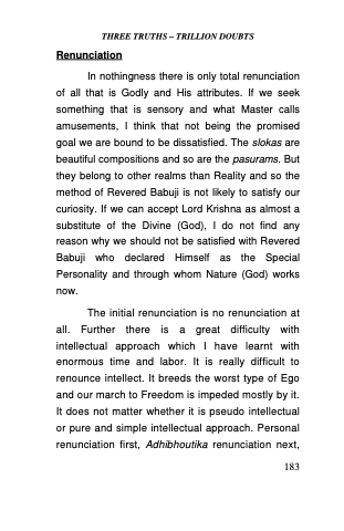 The initial renunciation is no renunciation at all. Further there is a great difficulty with intellectual approach which I have learnt with enormous time and labor. It is really difficult to renounce intellect. It breeds the worst type of Ego and our march to Freedom is impeded mostly by it. It does not matter whether it is pseudo intellectual or pure and simple intellectual approach. Personal renunciation first, Adhibhoutika renunciation next,