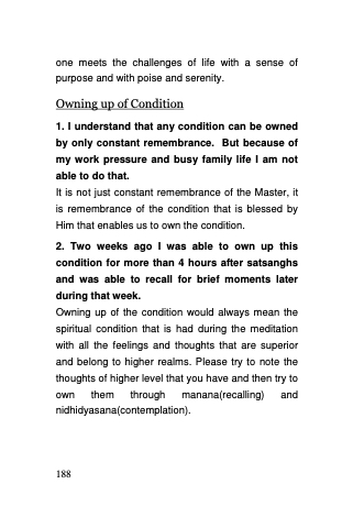 Owning up of the condition would always mean the spiritual condition that is had during the meditation with all the feelings and thoughts that are superior and belong to higher realms. Please try to note the thoughts of higher level that you have and then try to own them through manana(recalling) and nidhidyasana(contemplation).