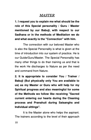2. It is appropriate to consider You / Trainer / Babuji (But physically only You are available to us) as my Master or Guru who will help for my Spiritual progress and also meaningful for some of the Methods we follow like receiving "Sacred current entering our hearts during the Cleaning process and Pranahuti during Satsanghs and Individual sittings".