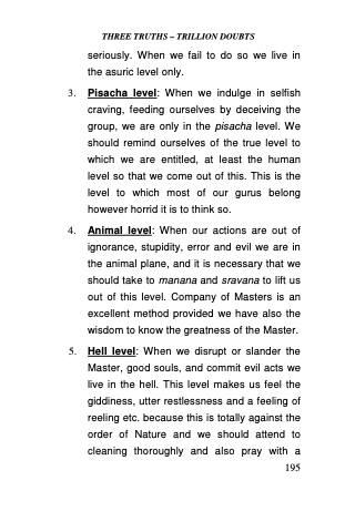 4. Animal level: When our actions are out of ignorance, stupidity, error and evil we are in the animal plane, and it is necessary that we should take to manana and sravana to lift us out of this level. Company of Masters is an excellent method provided we have also the wisdom to know the greatness of the Master.