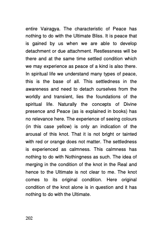 entire Vairagya. The characteristic of Peace has nothing to do with the Ultimate Bliss. It is peace that is gained by us when we are able to develop detachment or due attachment. Restlessness will be there and at the same time settled condition which we may experience as peace of a kind is also there. In spiritual life we understand many types of peace, this is the base of all. This settledness in the awareness and need to detach ourselves from the worldly and transient, lies the foundations of the spiritual life. Naturally the concepts of Divine presence and Peace (as is explained in books) has no relevance here. The experience of seeing colours (in this case yellow) is only an indication of the arousal of this knot. That it is not bright or tainted with red or orange does not matter. The settledness is experienced as calmness. This calmness has nothing to do with Nothingness as such. The idea of merging in the condition of the knot in the Real and hence to the Ultimate is not clear to me. The knot comes to its original condition. Here original condition of the knot alone is in question and it has nothing to do with the Ultimate.