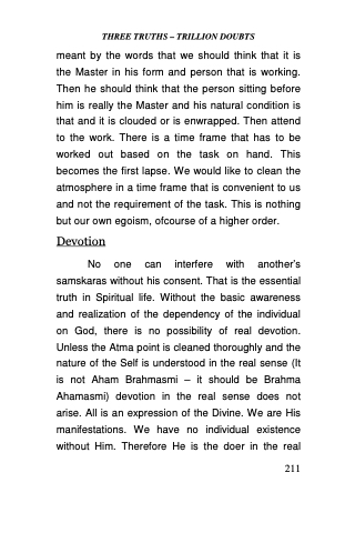No one can interfere with another’s samskaras without his consent. That is the essential truth in Spiritual life. Without the basic awareness and realization of the dependency of the individual on God, there is no possibility of real devotion. Unless the Atma point is cleaned thoroughly and the nature of the Self is understood in the real sense (It is not Aham Brahmasmi – it should be Brahma Ahamasmi) devotion in the real sense does not arise. All is an expression of the Divine. We are His manifestations. We have no individual existence without Him. Therefore He is the doer in the real