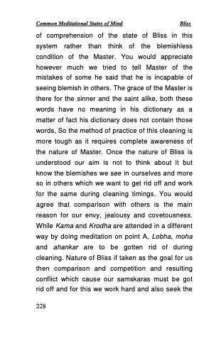 of comprehension of the state of Bliss in this system rather than think of the blemishless condition of the Master. You would appreciate however much we tried to tell Master of the mistakes of some he said that he is incapable of seeing blemish in others. The grace of the Master is there for the sinner and the saint alike, both these words have no meaning in his dictionary as a matter of fact his dictionary does not contain those words, So the method of practice of this cleaning is more tough as it requires complete awareness of the nature of Master. Once the nature of Bliss is understood our aim is not to think about it but know the blemishes we see in ourselves and more so in others which we want to get rid off and work for the same during cleaning timings. You would agree that comparison with others is the main reason for our envy, jealousy and covetousness. While Kama and Krodha are attended in a different way by doing meditation on point A, Lobha, moha and ahankar are to be gotten rid of during cleaning. Nature of Bliss if taken as the goal for us then comparison and competition and resulting conflict which cause our samskaras must be got rid off and for this we work hard and also seek the