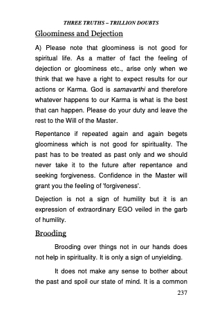 A) Please note that gloominess is not good for spiritual life. As a matter of fact the feeling of dejection or gloominess etc., arise only when we think that we have a right to expect results for our actions or Karma. God is samavarthi and therefore whatever happens to our Karma is what is the best that can happen. Please do your duty and leave the rest to the Will of the Master.