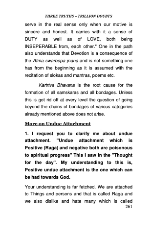 1. I request you to clarify me about undue attachment. "Undue attachment which is Positive (Raga) and negative both are poisonous to spiritual progress" This I saw in the "Thought for the day". My understanding to this is, Positive undue attachment is the one which can be had towards God.