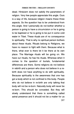 dead. Hinduism does not satisfy the parameters of religion. Very few people appreciate this angle. Ours is a way of life, because religion means these three aspects. So the question has to be understood from this angle. And I personally do not bother whether a person is going to have a circumcision or he is going to be baptized or he is going to be put in some cold water in Tibet. These rituals are of no consequence to spirituality. That is why no spiritual person bothers about these rituals. Rituals belong to Religions, we have no reason to fight with them. Because what is there, what ever is there let it be there at its own place. The Marriage rituals will be going on. We have our rituals, he has his rituals. Whereas when it comes to the question of burials, fundamental differences are there. Some religions do not believe in rebirth and a person who does not believe in a re- birth does not have anything to do with spirituality. Because spirituality is the awareness that one has got a body which is not confined to this body. People who do not believe in re-birth are only talking that body will not be re-born. Naturally body will never be re-born. This should be conceded. But they will slowly understand that there is something called astral presence and it should not be a matter for us