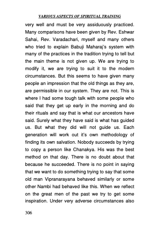 very well and must be very assiduously practiced. Many comparisons have been given by Rev. Eshwar Sahai, Rev. Varadachari, myself and many others who tried to explain Babuji Maharaj’s system with many of the practices in the tradition trying to tell but the main theme is not given up. We are trying to modify it, we are trying to suit it to the modern circumstances. But this seems to have given many people an impression that the old things as they are, are permissible in our system. They are not. This is where I had some tough talk with some people who said that they get up early in the morning and do their rituals and say that is what our ancestors have said. Surely what they have said is what has guided us. But what they did will not guide us. Each generation will work out it’s own methodology of finding its own salvation. Nobody succeeds by trying to copy a person like Chanakya. His was the best method on that day. There is no doubt about that because he succeeded. There is no point in saying that we want to do something trying to say that some old man Vipranarayana behaved similarly or some other Nambi had behaved like this. When we reflect on the great men of the past we try to get some inspiration. Under very adverse circumstances also