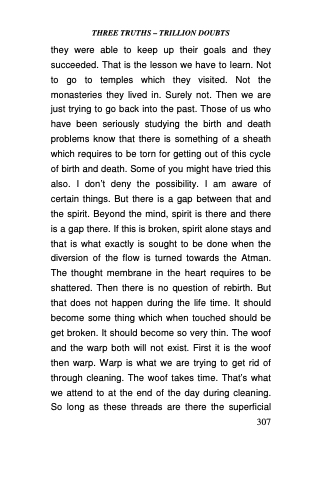 they were able to keep up their goals and they succeeded. That is the lesson we have to learn. Not to go to temples which they visited. Not the monasteries they lived in. Surely not. Then we are just trying to go back into the past. Those of us who have been seriously studying the birth and death problems know that there is something of a sheath which requires to be torn for getting out of this cycle of birth and death. Some of you might have tried this also. I don’t deny the possibility. I am aware of certain things. But there is a gap between that and the spirit. Beyond the mind, spirit is there and there is a gap there. If this is broken, spirit alone stays and that is what exactly is sought to be done when the diversion of the flow is turned towards the Atman. The thought membrane in the heart requires to be shattered. Then there is no question of rebirth. But that does not happen during the life time. It should become some thing which when touched should be get broken. It should become so very thin. The woof and the warp both will not exist. First it is the woof then warp. Warp is what we are trying to get rid of through cleaning. The woof takes time. That’s what we attend to at the end of the day during cleaning. So long as these threads are there the superficial