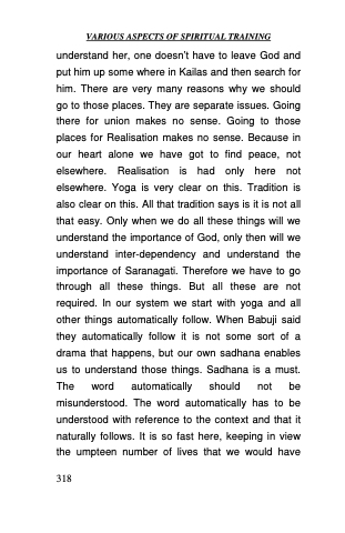 understand her, one doesn’t have to leave God and put him up some where in Kailas and then search for him. There are very many reasons why we should go to those places. They are separate issues. Going there for union makes no sense. Going to those places for Realisation makes no sense. Because in our heart alone we have got to find peace, not elsewhere. Realisation is had only here not elsewhere. Yoga is very clear on this. Tradition is also clear on this. All that tradition says is it is not all that easy. Only when we do all these things will we understand the importance of God, only then will we understand inter-dependency and understand the importance of Saranagati. Therefore we have to go through all these things. But all these are not required. In our system we start with yoga and all other things automatically follow. When Babuji said they automatically follow it is not some sort of a drama that happens, but our own sadhana enables us to understand those things. Sadhana is a must. The word automatically should not be misunderstood. The word automatically has to be understood with reference to the context and that it naturally follows. It is so fast here, keeping in view the umpteen number of lives that we would have