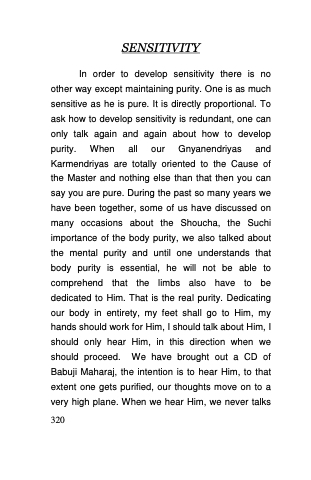 In order to develop sensitivity there is no other way except maintaining purity. One is as much sensitive as he is pure. It is directly proportional. To ask how to develop sensitivity is redundant, one can only talk again and again about how to develop purity. When all our Gnyanendriyas and Karmendriyas are totally oriented to the Cause of the Master and nothing else than that then you can say you are pure. During the past so many years we have been together, some of us have discussed on many occasions about the Shoucha, the Suchi importance of the body purity, we also talked about the mental purity and until one understands that body purity is essential, he will not be able to comprehend that the limbs also have to be dedicated to Him. That is the real purity. Dedicating our body in entirety, my feet shall go to Him, my hands should work for Him, I should talk about Him, I should only hear Him, in this direction when we should proceed. We have brought out a CD of Babuji Maharaj, the intention is to hear Him, to that extent one gets purified, our thoughts move on to a very high plane. When we hear Him, we never talks