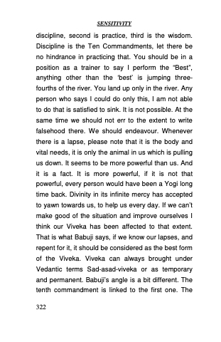 discipline, second is practice, third is the wisdom. Discipline is the Ten Commandments, let there be no hindrance in practicing that. You should be in a position as a trainer to say I perform the “Best”, anything other than the ‘best’ is jumping three- fourths of the river. You land up only in the river. Any person who says I could do only this, I am not able to do that is satisfied to sink. It is not possible. At the same time we should not err to the extent to write falsehood there. We should endeavour. Whenever there is a lapse, please note that it is the body and vital needs, it is only the animal in us which is pulling us down. It seems to be more powerful than us. And it is a fact. It is more powerful, if it is not that powerful, every person would have been a Yogi long time back. Divinity in its infinite mercy has accepted to yawn towards us, to help us every day. If we can’t make good of the situation and improve ourselves I think our Viveka has been affected to that extent. That is what Babuji says, if we know our lapses, and repent for it, it should be considered as the best form of the Viveka. Viveka can always brought under Vedantic terms Sad-asad-viveka or as temporary and permanent. Babuji’s angle is a bit different. The tenth commandment is linked to the first one. The