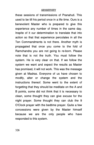 these sessions of transmissions of Pranahuti. This used to be till his period once in a life time. Ours is a benevolent Master who is prepared to give this experience any number of times in the same day. Inspite of it our determination to translate that into action so that that experience percolates in all the Ten Commandments is not there. Another myth is propagated that once you come to the fold of Ramchandra you are not going to re-born. Please note that is not the truth. You must follow the system. He is very clear on that. If we follow the system we want and expect the results as Master has promised, it will not work. This was the message given at Madras. Everyone of us have chosen to modify, alter or change the system and the instructions thereof. Some went to the extent of forgetting that they should be meditate on the A and B points, some did not think that it is necessary to clean, some thought they can give excuse for the night prayer. Some thought they can club the 9 O’Clock prayer with the bedtime prayer. Quite a few concessions were given by the Master himself because we are the only people who have responded to this system.