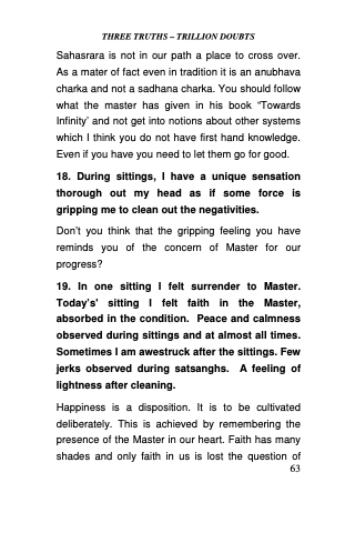 19. In one sitting I felt surrender to Master. Today’s' sitting I felt faith in the Master, absorbed in the condition. Peace and calmness observed during sittings and at almost all times. Sometimes I am awestruck after the sittings. Few jerks observed during satsanghs. A feeling of lightness after cleaning.