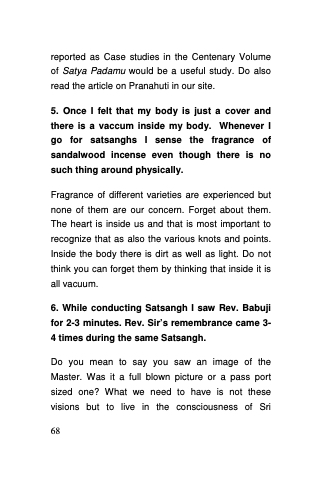5. Once I felt that my body is just a cover and there is a vaccum inside my body. Whenever I go for satsanghs I sense the fragrance of sandalwood incense even though there is no such thing around physically.