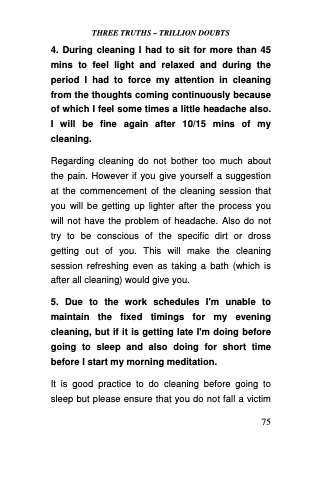 4. During cleaning I had to sit for more than 45 mins to feel light and relaxed and during the period I had to force my attention in cleaning from the thoughts coming continuously because of which I feel some times a little headache also. I will be fine again after 10/15 mins of my cleaning.