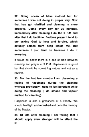 32. Doing ocean of bliss method but for sometime I was not doing in proper way. Now that has got clarified and cleaning is more effective. Doing every day for 20 minutes. Immediately after cleaning I do the 9 P.M and after that I do bedtime. Bedtime prayer I tend to cry asking God to help and forgive, which actually comes from deep inside me. But sometimes I just tend do because I do it everyday.