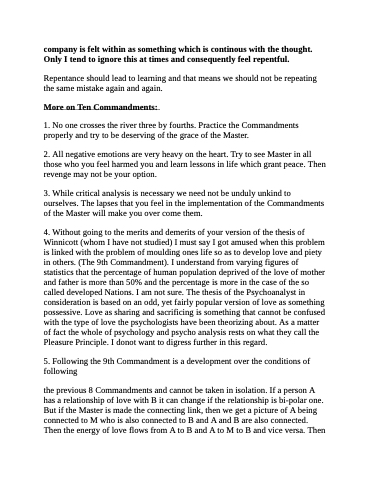 4. Without going to the merits and demerits of your version of the thesis of Winnicott (whom I have not studied) I must say I got amused when this problem is linked with the problem of moulding ones life so as to develop love and piety in others. (The 9th Commandment). I understand from varying figures of statistics that the percentage of human population deprived of the love of mother and father is more than 50% and the percentage is more in the case of the so called developed Nations. I am not sure. The thesis of the Psychoanalyst in consideration is based on an odd, yet fairly popular version of love as something possessive. Love as sharing and sacrificing is something that cannot be confused with the type of love the psychologists have been theorizing about. As a matter of fact the whole of psychology and psycho analysis rests on what they call the Pleasure Principle. I donot want to digress further in this regard.