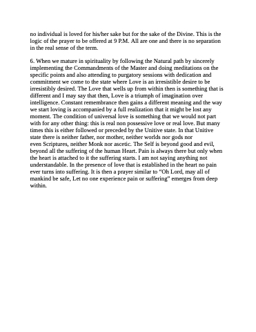 6. When we mature in spirituality by following the Natural path by sincerely implementing the Commandments of the Master and doing meditations on the specific points and also attending to purgatory sessions with dedication and commitment we come to the state where Love is an irresistible desire to be irresistibly desired. The Love that wells up from within then is something that is different and I may say that then, Love is a triumph of imagination over intelligence. Constant remembrance then gains a different meaning and the way we start loving is accompanied by a full realization that it might be lost any moment. The condition of universal love is something that we would not part with for any other thing: this is real non possessive love or real love. But many times this is either followed or preceded by the Unitive state. In that Unitive state there is neither father, nor mother, neither worlds nor gods nor