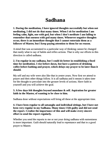 4. I have been regular to all satsanghs and individual sittings, but I have not been very regular in my Sadhana. Many times I felt guilty and did not send the report. I realize the importance of this and will make every sincere effort to send the report regularly.