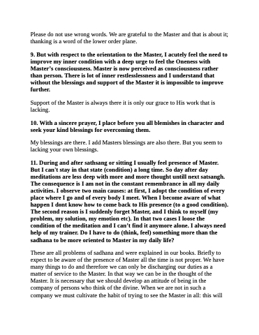 9. But with respect to the orientation to the Master, I acutely feel the need to improve my inner condition with a deep urge to feel the Oneness with Master’s consciousness. Master is now perceived as consciousness rather than person. There is lot of inner restlesslessness and I understand that without the blessings and support of the Master it is impossible to improve further.