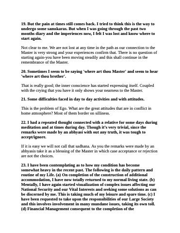 19. But the pain at times still comes back. I tried to think this is the way to undergo some samskaras. But when I was going through the past two months diary and the imperiences now, I felt I was lost and know where to start again.