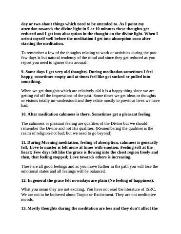 day or two about things which need to be attended to. As I point my attention towards the divine light in 5 or 10 minutes these thoughts get reduced and I get into absorption in the thought on the divine light. When I orient myself well before the meditation I get into absorption soon after starting the meditation.
