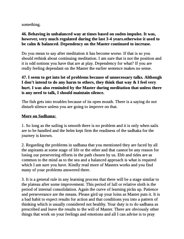 47. I seem to get into lot of problems because of unnecessary talks. Although I don’t intend to do any harm to others, they think that way & I feel very hurt. I was also reminded by the Master during meditation that unless there is any need to talk, I should maintain silence.