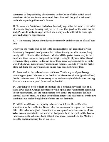 11. To know one’s mistakes and whole heartedly repent for the same is the index of wisdom. To go on thinking that you erred is neither good for the mind nor the soul. Please do sadhana as prescribed and it may not be difficult to come upto your and Masters’ expectations.
