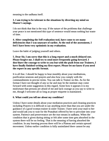It is all fine. I should be happy to hear monthly about your meditations, purification sessions and prayers and also how you comply with the commandments in precise terms. You can talk to Trainer on this. As for the format I have not thought of any so far and may be the institute may come forward with some suggestion in this regard. Some how it appears it is my misfortune that persons are afraid of me and lack courage as you say to write to me, though I welcome all so long as proper etiquette is maintained.