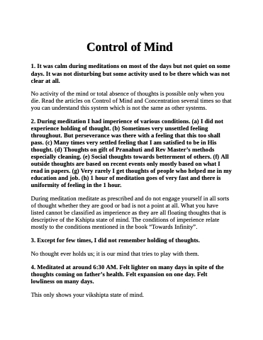 2. During meditation I had imperience of various conditions. (a) I did not experience holding of thought. (b) Sometimes very unsettled feeling throughout. But perseverance was there with a feeling that this too shall pass. (c) Many times very settled feeling that I am satisfied to be in His thought. (d) Thoughts on gift of Pranahuti and Rev Master’s methods especially cleaning. (e) Social thoughts towards betterment of others. (f) All outside thoughts are based on recent events only mostly based on what I read in papers. (g) Very rarely I get thoughts of people who helped me in my education and job. (h) 1 hour of meditation goes of very fast and there is uniformity of feeling in the 1 hour.