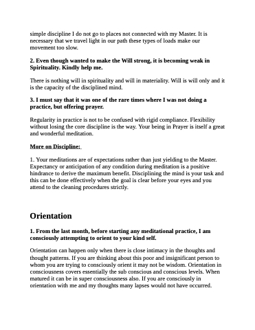 1. Your meditations are of expectations rather than just yielding to the Master. Expectancy or anticipation of any condition during meditation is a positive hindrance to derive the maximum benefit. Disciplining the mind is your task and this can be done effectively when the goal is clear before your eyes and you attend to the cleaning procedures strictly.