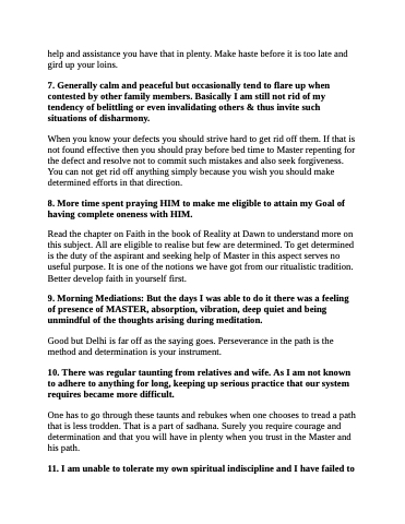 9. Morning Mediations: But the days I was able to do it there was a feeling of presence of MASTER, absorption, vibration, deep quiet and being unmindful of the thoughts arising during meditation.