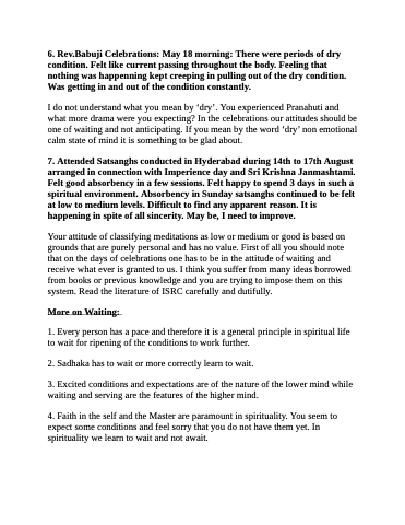 6. Rev.Babuji Celebrations: May 18 morning: There were periods of dry condition. Felt like current passing throughout the body. Feeling that nothing was happenning kept creeping in pulling out of the dry condition. Was getting in and out of the condition constantly.