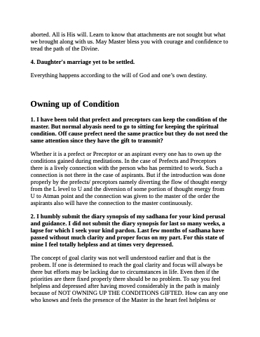 Whether it is a prefect or Preceptor or an aspirant every one has to own up the conditions gained during meditations. In the case of Prefects and Preceptors there is a lively connection with the person who has permitted to work. Such a connection is not there in the case of aspirants. But if the introduction was done properly by the prefects/ preceptors namely diverting the flow of thought energy from the L level to U and the diversion of some portion of thought energy from U to Atman point and the connection was given to the master of the order the aspirants also will have the connection to the master continuously.