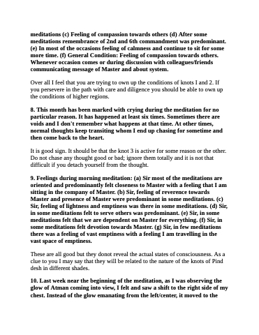 meditations (c) Feeling of compassion towards others (d) After some meditations remembrance of 2nd and 6th commandment was predominant. (e) In most of the occasions feeling of calmness and continue to sit for some more time. (f) General Condition: Feeling of compassion towards others. Whenever occasion comes or during discussion with colleagues/friends communicating message of Master and about system.