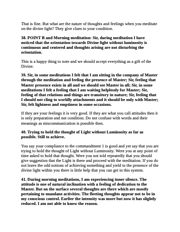 38. POINT B and Morning meditation: Sir, during meditation I have noticed that the orientation towards Divine light without luminosity is continuous and centered and thoughts arising are not disturbing the orientation.