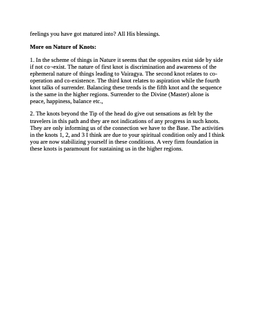 1. In the scheme of things in Nature it seems that the opposites exist side by side if not co¬exist. The nature of first knot is discrimination and awareness of the ephemeral nature of things leading to Vairagya. The second knot relates to co- operation and co-existence. The third knot relates to aspiration while the fourth knot talks of surrender. Balancing these trends is the fifth knot and the sequence is the same in the higher regions. Surrender to the Divine (Master) alone is peace, happiness, balance etc.,