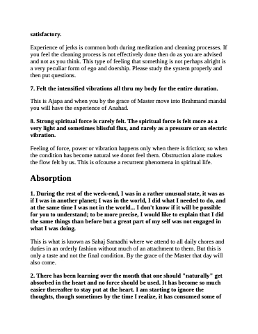 2. There has been learning over the month that one should "naturally" get absorbed in the heart and no force should be used. It has become so much easier thereafter to stay put at the heart. I am starting to ignore the thoughts, though sometimes by the time I realize, it has consumed some of
