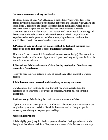 The three letters of Om, A U M has also a half a letter ‘hum’. The first letter grants us wisdom regarding the conscious activities and is called Vaiswanara, the second one U relates to the dream like state during meditation which comes under the name Taijasa and the third letter M is where there is simple consciousness and is called Prajna. During our meditations we do go through all these states and it is but natural. The fourth state is called Turiya which we experience due to the grace of the Master everyday when we meditate. We would like to live in that state but that is not natural.