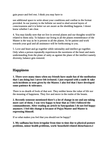 2. Recently someone mentioned there’s a lot of change in me and am taking more care of them. I was very happy to hear that as I felt I followed the commandments. After reading an article in Satyapadam I do not feel happy anymore. I feel this change is because of Pujya Master and Master is expressing Himself.