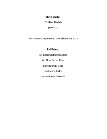 Three Truths – Trillion Doubts (Part – 2) First Edition: Imperience Day Celebrations 2012 Publishers: Sri Ramchandra Publishers 4th Floor Laxmi Plaza Entrenchment Road East Marredpally Secunderabad -500 026